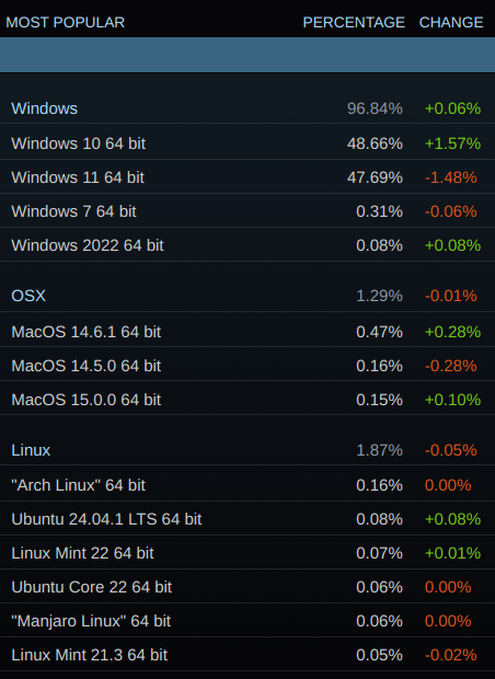 2024년 9월, Steam 설문조사 결과에 따르면 1.87%의 사용자가 Linux에서 게임을 즐기고 있다고 합니다.