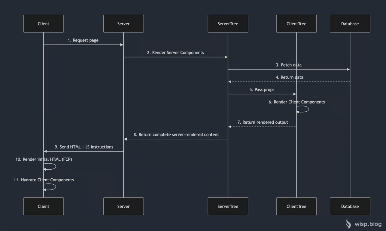 서버 트리(Server Tree)에서 데이터를 준비한 후, 이를 props로 클라이언트 트리(Client Tree)에 전달합니다.