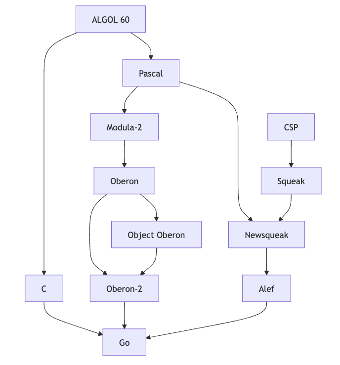 아래 그림은 Go 언어에 영향을 준 언어들을 나타낸 것입니다. 화살표는 영향을 준 방향을 가리킵니다.