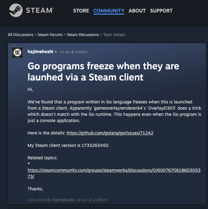 최근 Steam(스팀) 커뮤니티에서 "Steam이 Go 런타임을 망가뜨린다(Steam breaks Go runtime)"는 제목의 글이 올라와 뜨거운 논쟁이 벌어지고 있습니다.