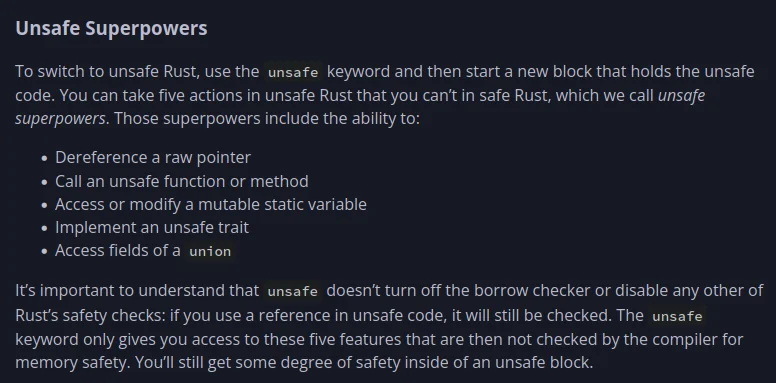 사실, 공식 문서에서는 "'unsafe' doesn’t turn off the Borrow Checker or disable any other of Rust’s safety checks"라고 명확히 밝히고 있습니다.