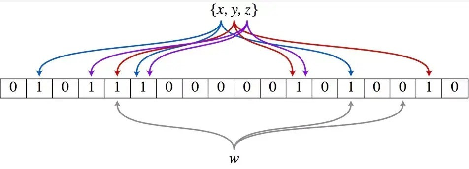 예를 들어, 집합에 3개의 원소 ({x, y, z})가 있고, 3개의 해시 함수(hash function)를 사용한다고 가정해 보겠습니다