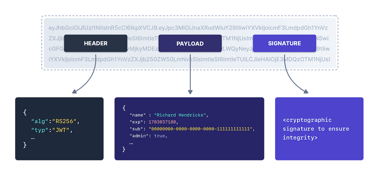 JWT 문자열은 위 예시처럼 마침표(.)로 연결된 세 부분으로 이루어져 있는데요.